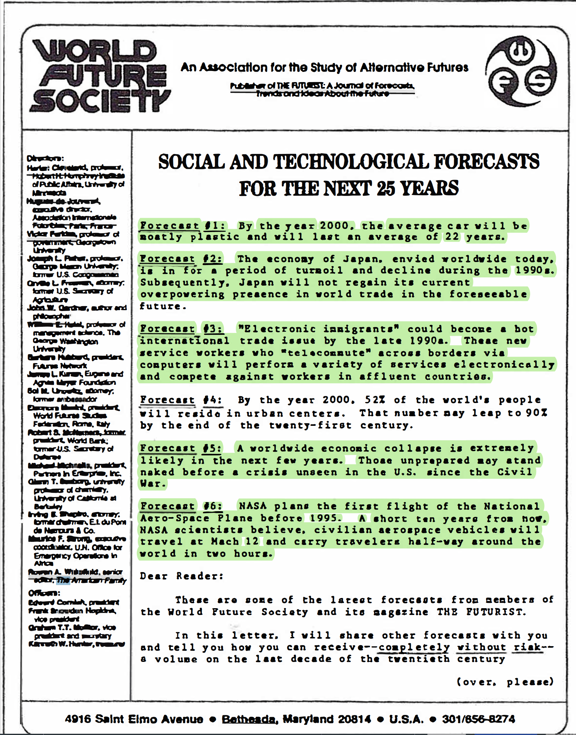 Check it out. It was from the World Future Society, and these forecasts were simply right on the money.