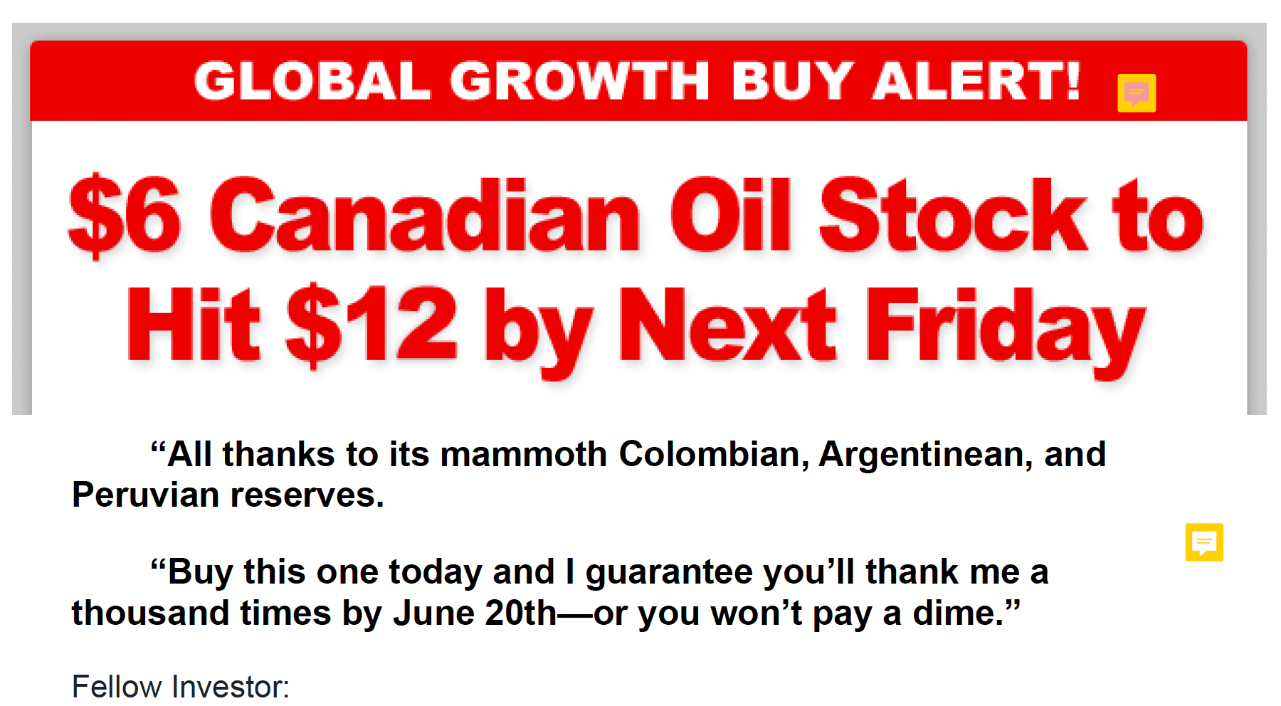 As you can see in this example, it's fairly clear what this email promotion is all about, "The $ 6 Canadian Oil Stock to Hit $12 By Friday."